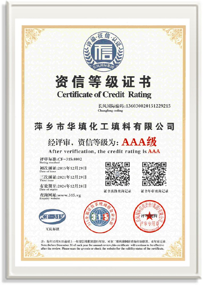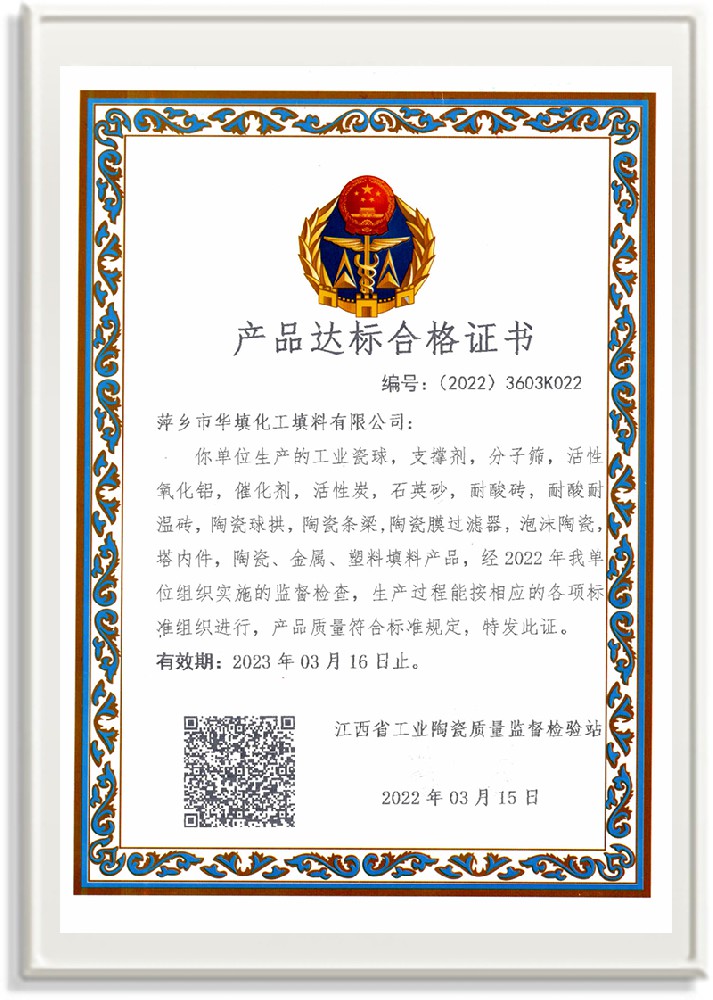 萍鄉(xiāng)市華填化工填料有限公司,位于320國道、109國道、浙贛鐵路、昌金高速公路貫穿其中,交通便利,是江西西部一顆燦爛明珠,創(chuàng)建于20世紀70年代初期,是中國石油天然氣股份有限公司“能源一號網”會員企業(yè)、中國石化物資采購電子商務網絡和中國海洋石油總公司采辦業(yè)務系統成員單位,是上海大學江西材料基因組工程產業(yè)研究院工業(yè)陶瓷產業(yè)創(chuàng)新聯盟基地,且通過ISO9001:2015質量管理體系、ISO14001:2015環(huán)境管理體系、ISO45001:2018職業(yè)健康安全管理體系認證的化工填料生產企業(yè)。公司擁有陶瓷、塑料、金屬填料、催化劑、活性氧化鋁、分子篩等產品生產線,現有固定資產3616萬元,占地面積3.8萬平方米。公司具有悠久的生產歷史、雄厚的技術力量和先進的生產工藝設備,可生產工業(yè)瓷球(支撐劑)、陶瓷、金屬、塑料質的規(guī)整、散堆化工填料及分子篩、催化劑、生化濾料、活性氧化鋁、石化助劑、活性炭、環(huán)保材料、耐火材料等系列的200多種規(guī)格型號產品。